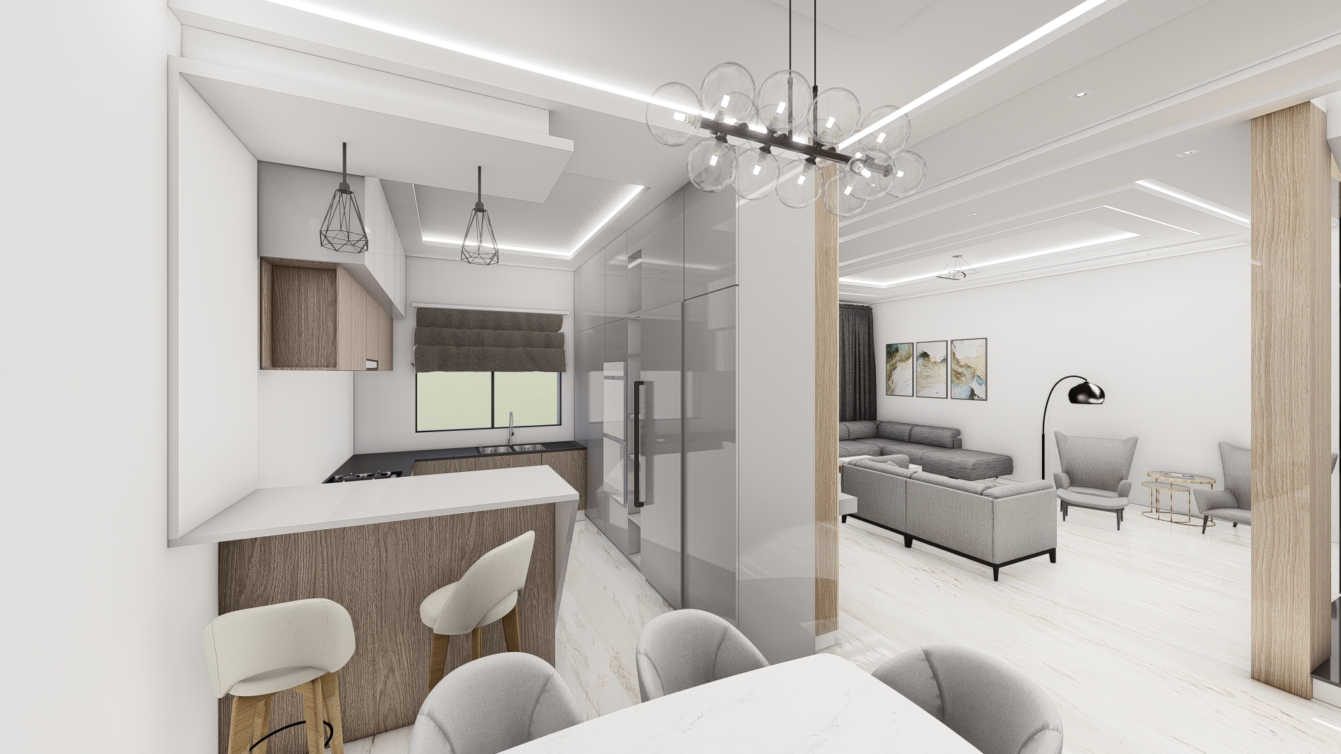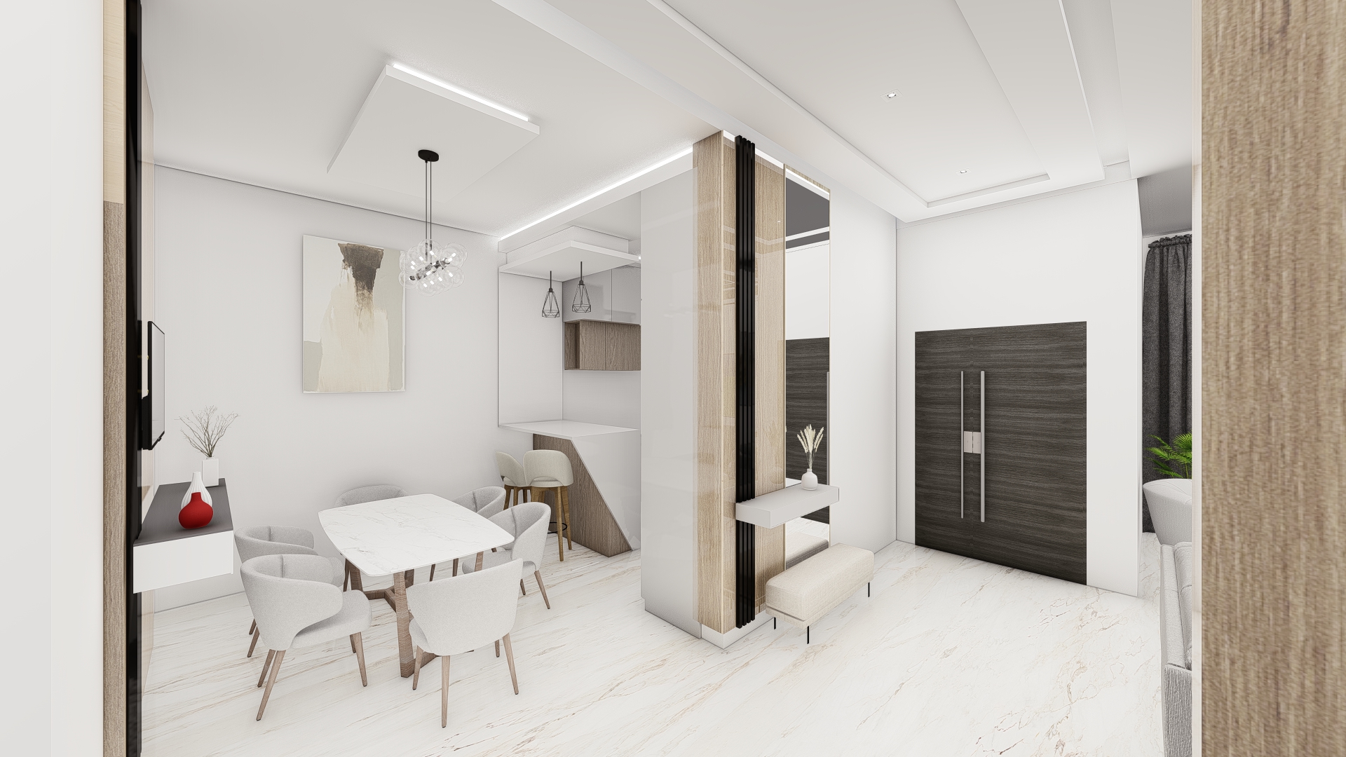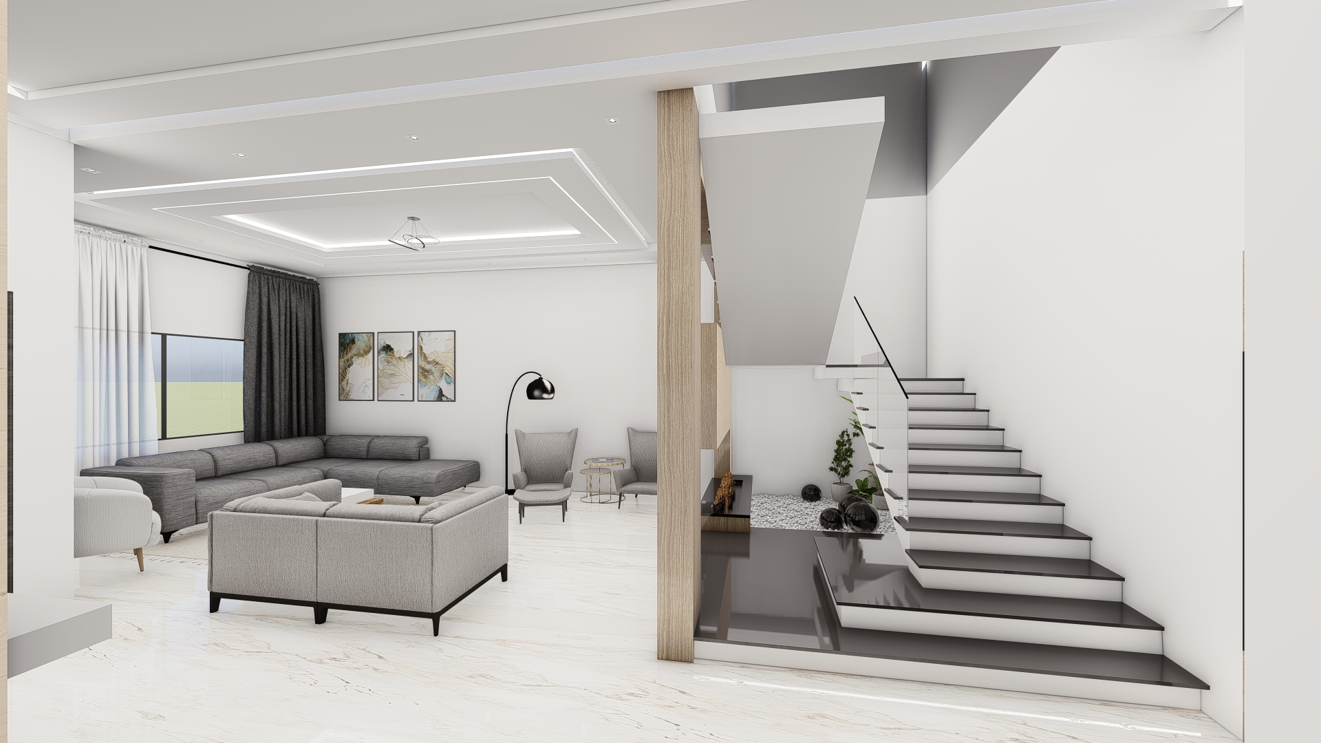 This modern residential project showcases a sleek and sophisticated design with a blend of neutral tones, wood accents, and minimalist decor. The interiors feature an open living room with elegant gray furniture, subtle artistic elements, and contemporary lighting fixtures that create a cozy atmosphere. The kitchen and dining area incorporate clean lines with high gloss cabinetry and wood finishes, enhancing the modern aesthetic. A stylish staircase with glass railing connects the floors, emphasizing transparency and space efficiency. The exterior includes a compact yet functional garden space equipped with outdoor seating, plants, and shaded areas, offering a perfect place for relaxation and outdoor gatherings. The facade boasts a combination of white walls, wood paneling, and large windows, giving the home a fresh and inviting curb appeal. Overall, the design focuses on simplicity, comfort, and functionality with a strong emphasis on modern elegance and indoor-outdoor harmony.