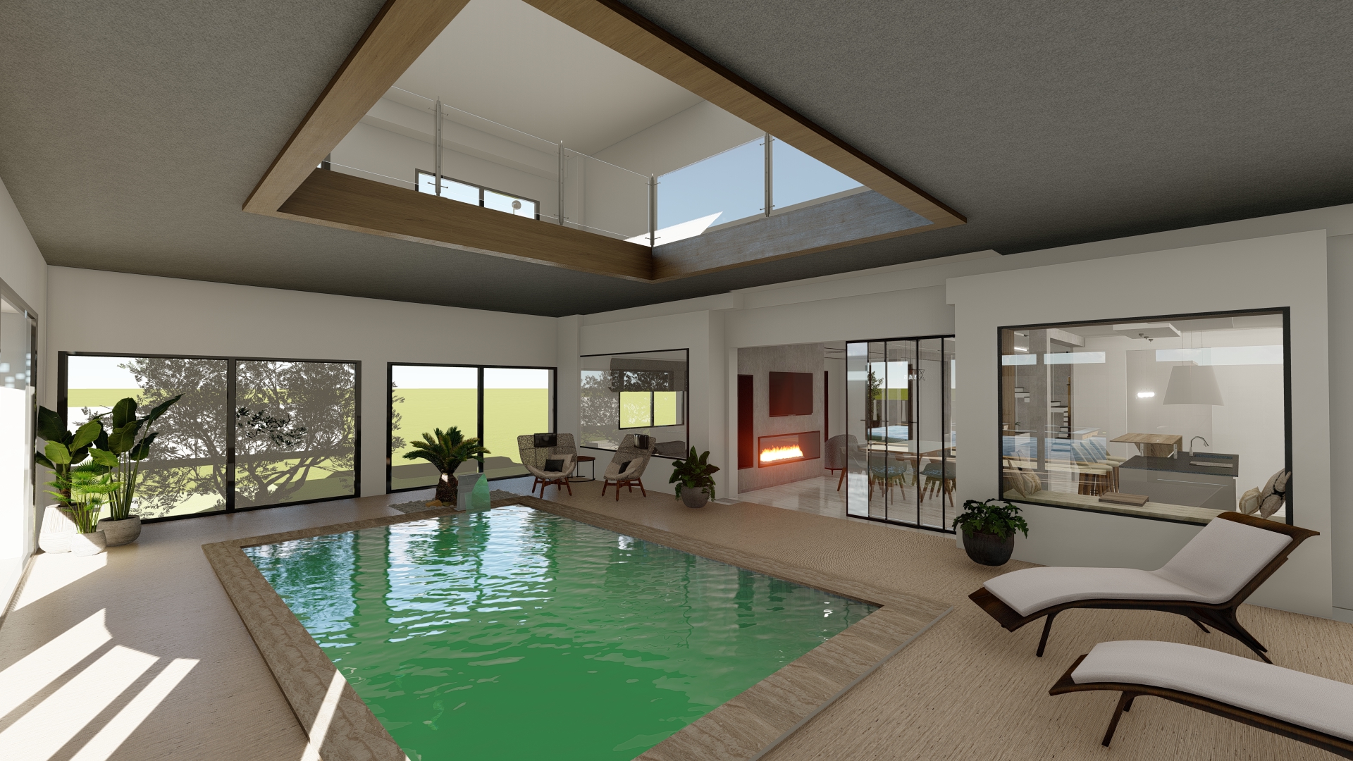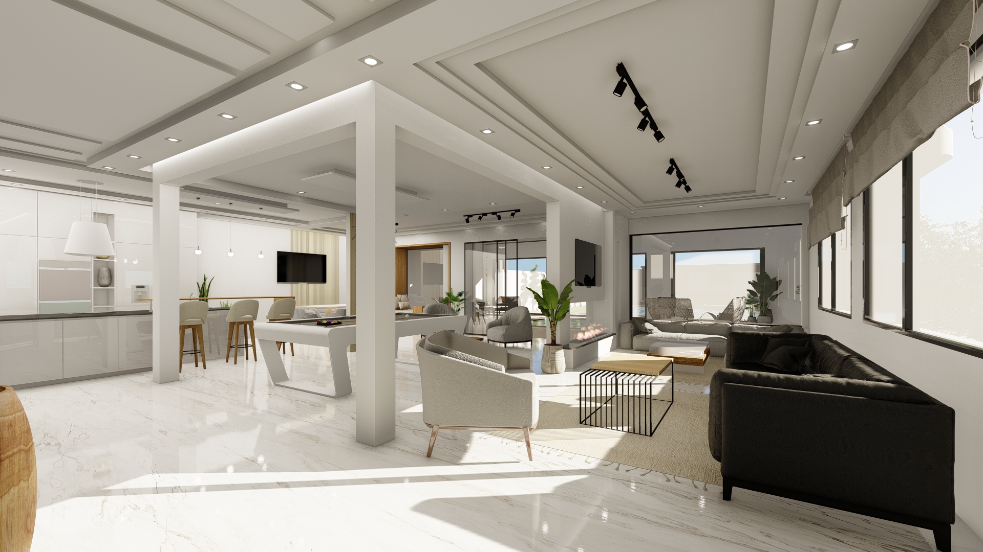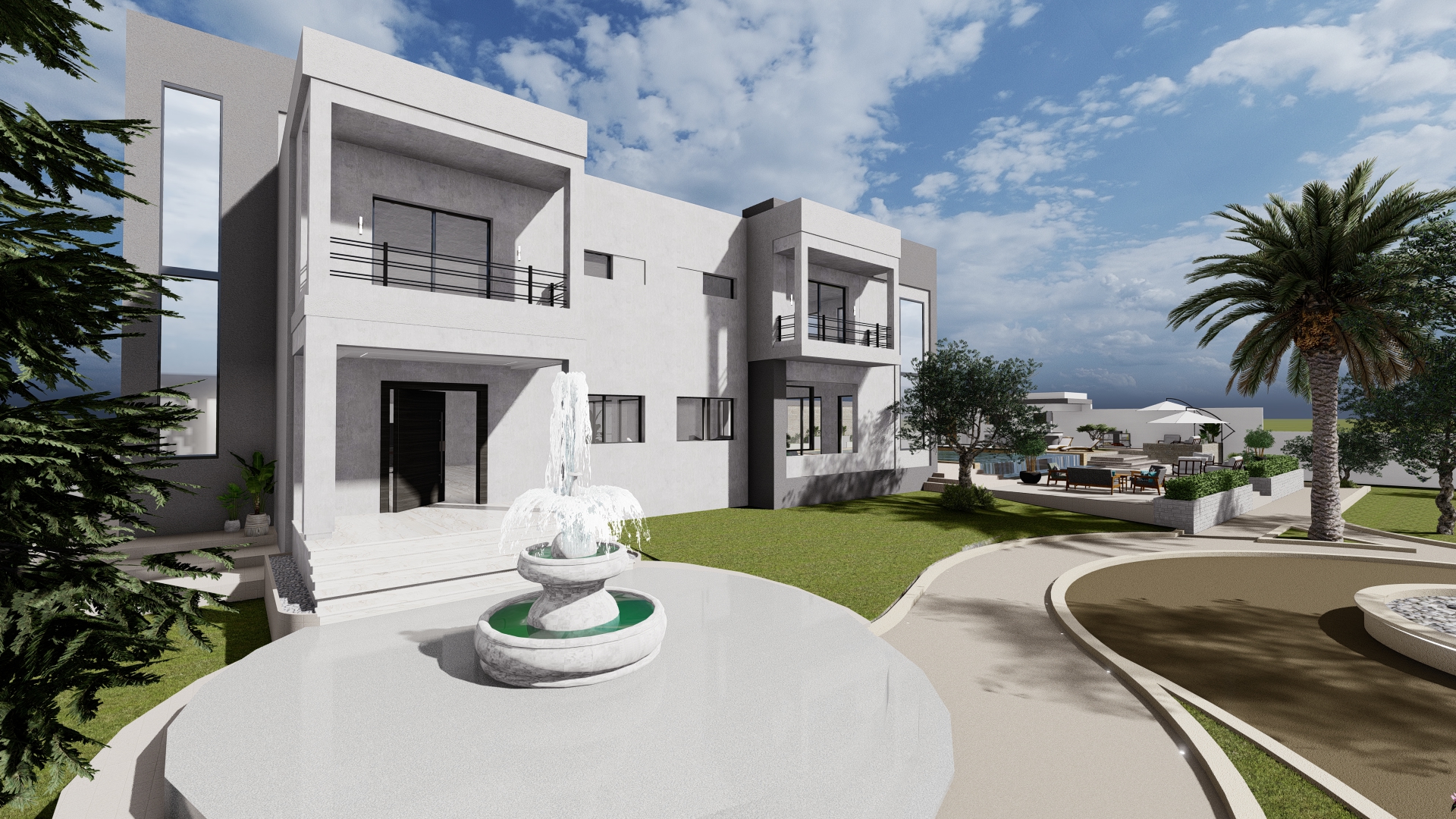 This project is a modern luxury villa that blends elegant geometry, openness, and comfort through a seamless connection between indoor and outdoor spaces. The design features large glass façades overlooking a stunning infinity pool, a sunken firepit lounge, and a refined mix of materials such as marble, wood, and matte finishes. Inside, an open-plan layout integrates a bright living area, a sleek kitchen, and an indoor pool illuminated by natural light from a central skylight. Warm lighting, minimalist lines, and balanced contrasts create a sophisticated atmosphere that defines contemporary high-end living.